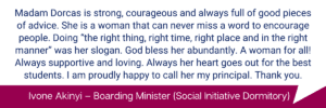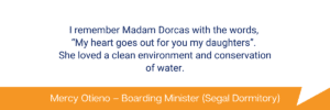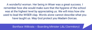 The Dorcas Oyugi Scholarship Fund is a give-back initiative by the former Principal of WISER, Madam Dorcas, as she celebrates her 14 years of service to WISER. During this period the girls’ enrollment at WISER grew from 30 – 240 students annually with alumni base of 370 who gained rare opportunity to thrive.